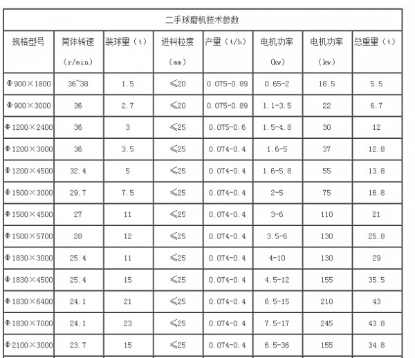 未曾接觸二手球磨機市場的用戶起初會對于二手設(shè)備領(lǐng)域有所顧忌,怕實現(xiàn)不了自己的生產(chǎn)需求,怕會有較高的折舊率等等,這些都是人們對二手球磨機的顧慮。但是隨著技術(shù)的發(fā)展,二手產(chǎn)品也是有了更高的性能,產(chǎn)品型號也越來越多樣化,下面一起看下部分二手球磨機的技術(shù)參數(shù),以供大家做參考,更詳細的參數(shù)值請咨詢廠家:13562910002